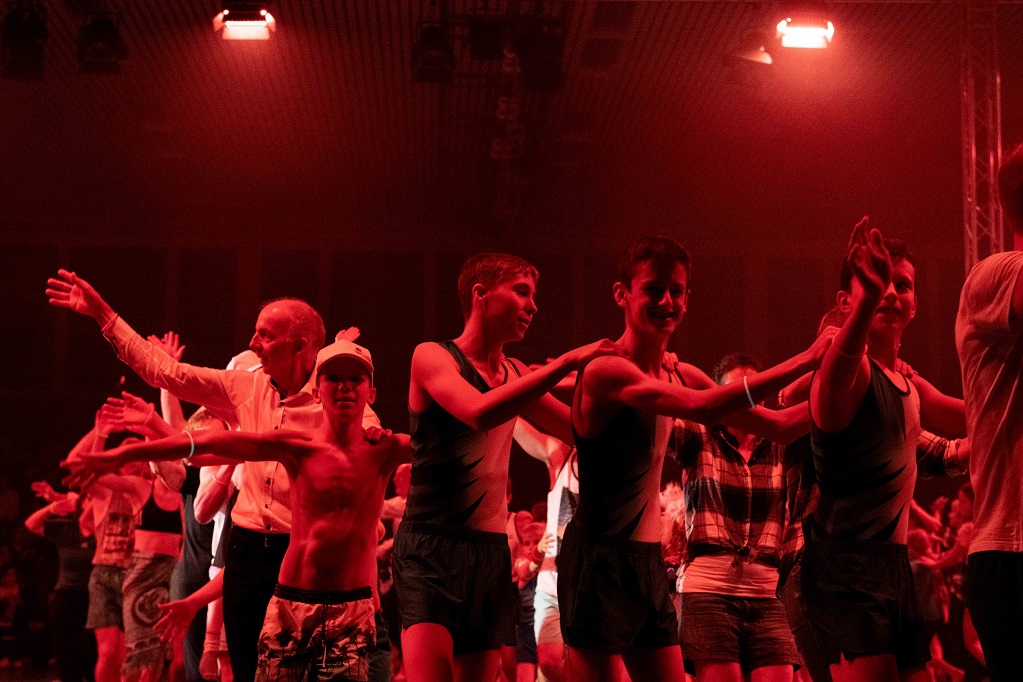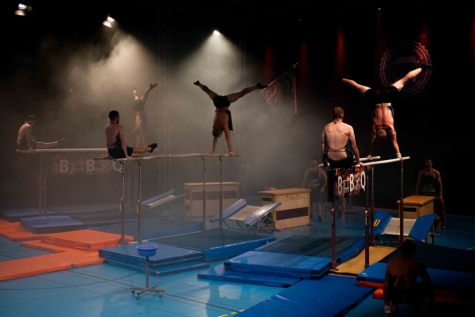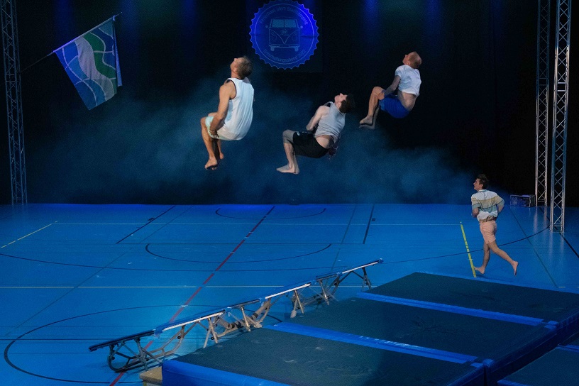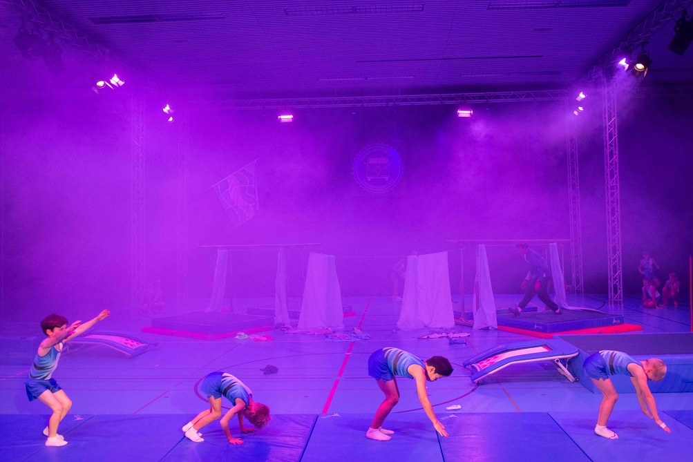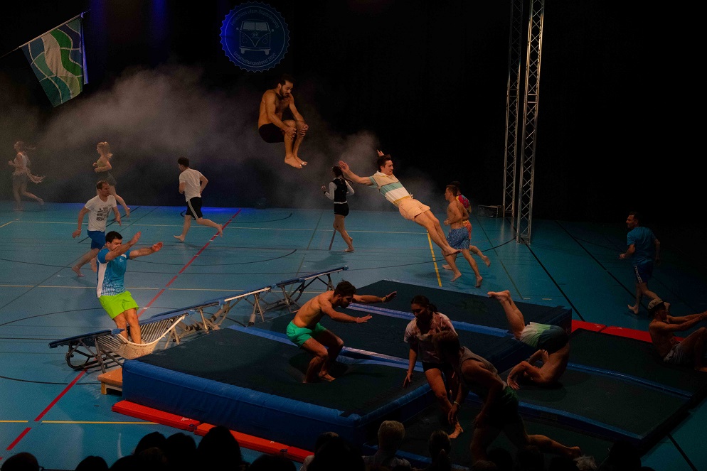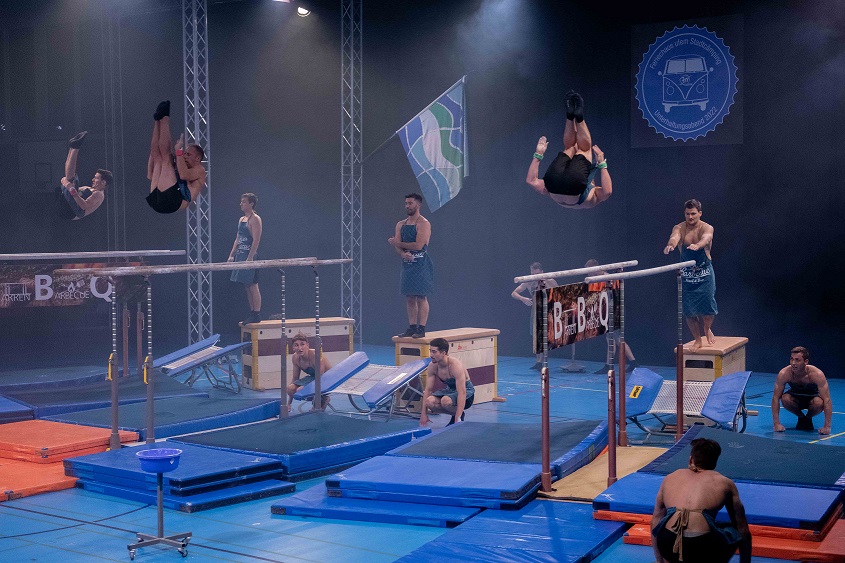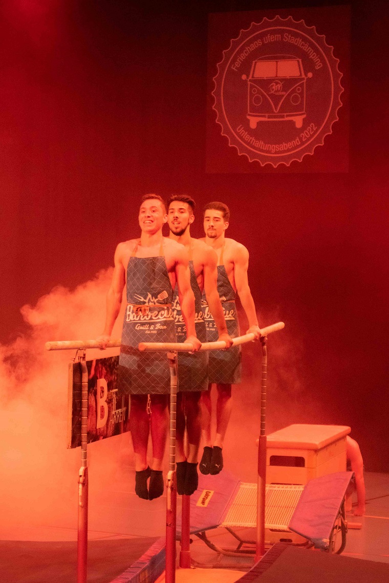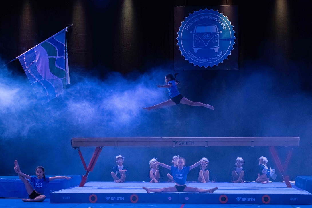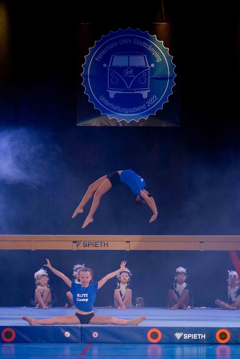 Nach einem tosenden Applaus zum Schluss der Nachmittagsshow folgt bereits die Vorbereitung für die Abendshow. Verbesserungspotenzial ist erkannt und Massnahmen sind eingeleitet, sodass bereits der Einlass entspannter verläuft. Beim VIP-Apéro folgen die Gäste erst den Lichtern, um dann der kurzweiligen Rede vom Co-Präsidenten Beni Boos zu lauschen. Bereits wenig später leitet Beni Boos auch die Abendshow ein und empfängt zum Check-in. Die Kutu Saltolinos fragen sich, ob sie schon da sind und die Geräteturner übertreiben es mit dem nächtlichen Lärm etwas, sodass sie frühmorgens zum Power Fit Workout antreten müssen. Am Cämping-Kiosk turnt das Jumix Kinderturnen mit ihren Lollipops und die TLZ Jugend steht unter Zuckerschock. Vom gechillten Surfer genervt holt sich die «Geraniengeiss» Unterstützung bei den Proficämper-Frauen. Knackig geht es zu beim BarrBQ des TLZ Barren, die in der Pause auch noch die Pausenkasse mit dem Getränkeverkauf füllen.