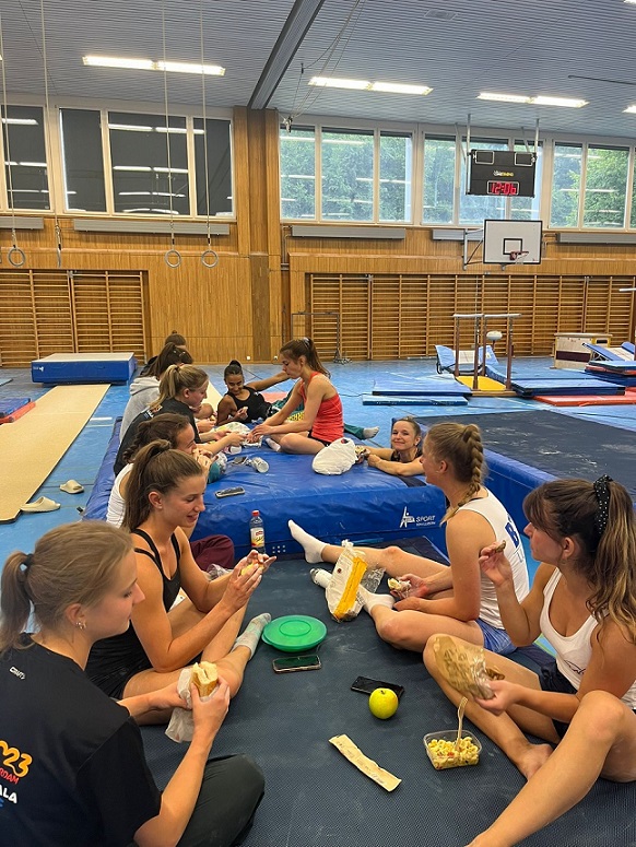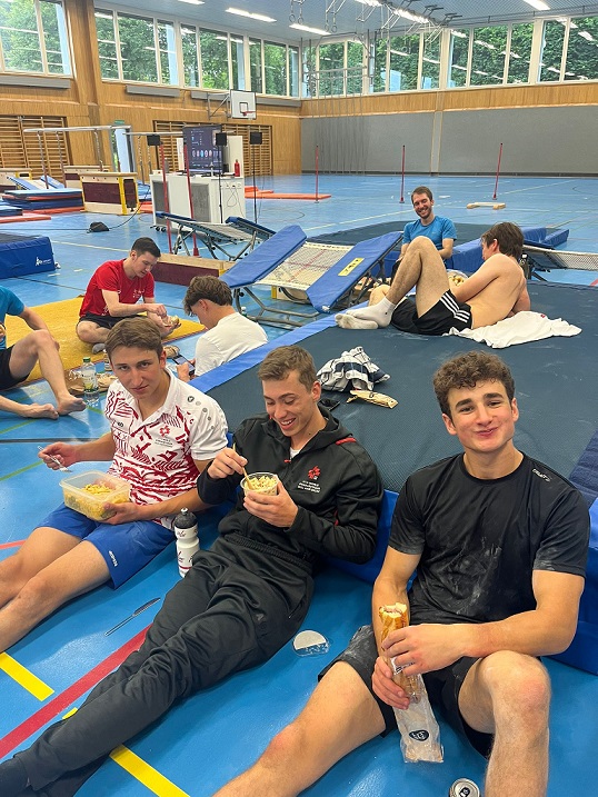 Am Samstagmorgen geht es für die Barren-Jungs und dem Team Aerobic Paar direkt weiter. Nach dem Aufwärmen wird intensiv trainiert und die Übungen genau analysiert. Zwei Stunden später trifft auch der Rest der Gruppe ein und es folgt das Training an den Schaukelringen. Nach dem Mittagessen und somit als letztes Gerät geht’s an der Sprung.