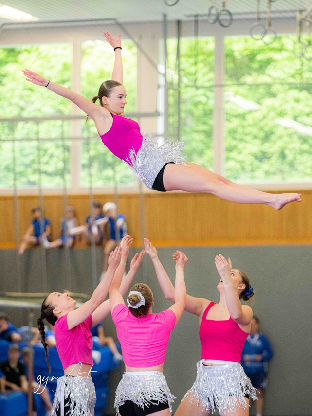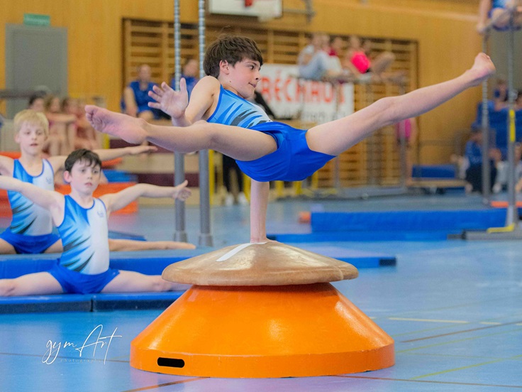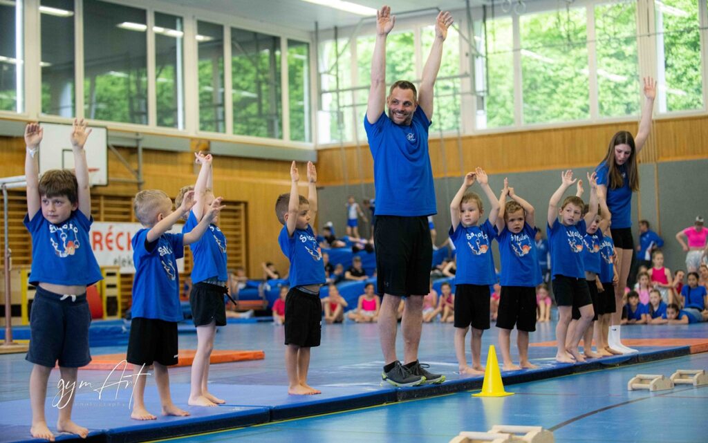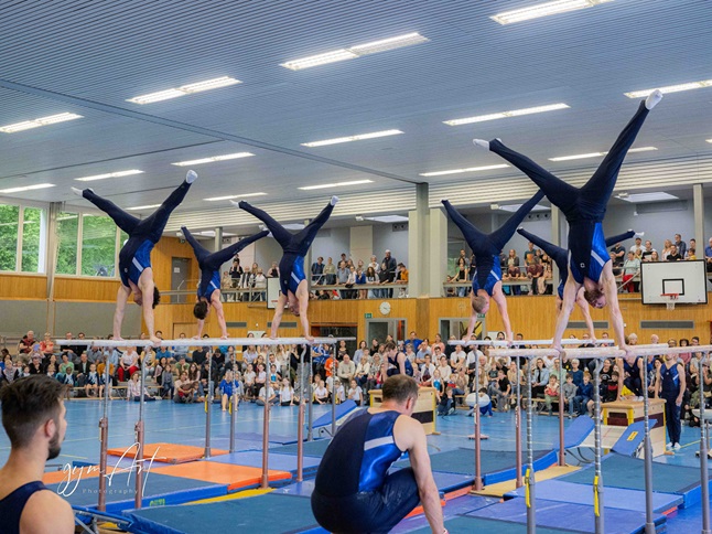 Um das Publikum etwas aufzulockern, animiert Beni Boos mit wenigen Bewegungen zu einer kurzen, eingängigen Melodie zum Mitmachen. Mit Power folgt dann der Barren, nochmals die Kunstturnerinnen und dann die Kunstturner mit vielen Übungen an den Geräten. Das Schlussbouquet macht dann das abschliessende Sprungprogramm.