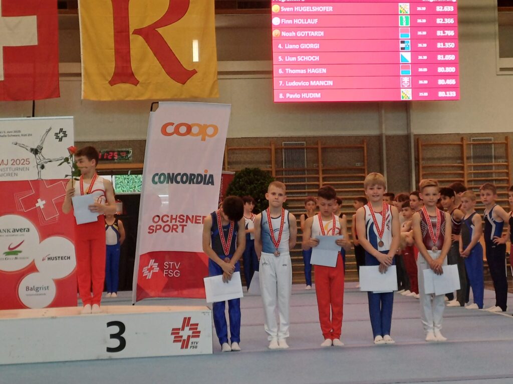 Rüti, 31. Mai / 1. Juni 2025. Die 4 BTV-Turner Ludovico Mancin, Livio Gutknecht, Joscha Kurer und Maurice Duss zeigen bei den Schweizer Juniorenmeisterschaften im Kunstturnen sehr gute Leistungen.